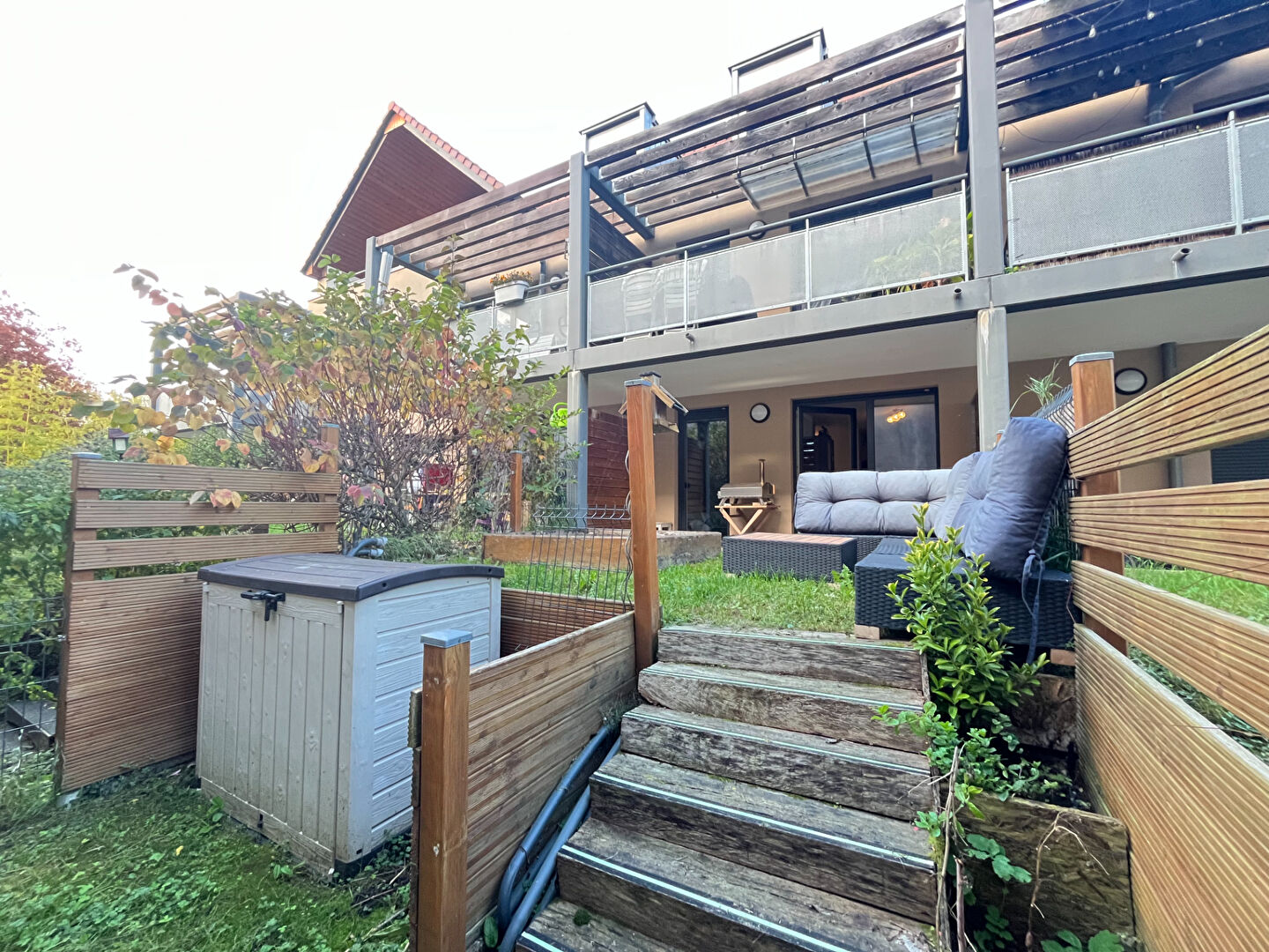 Accessible du salon et de la chambre vous pourrez profiter d'un bel espace extérieur avec une terrasse couverte et un jardin le tout sur 40m²