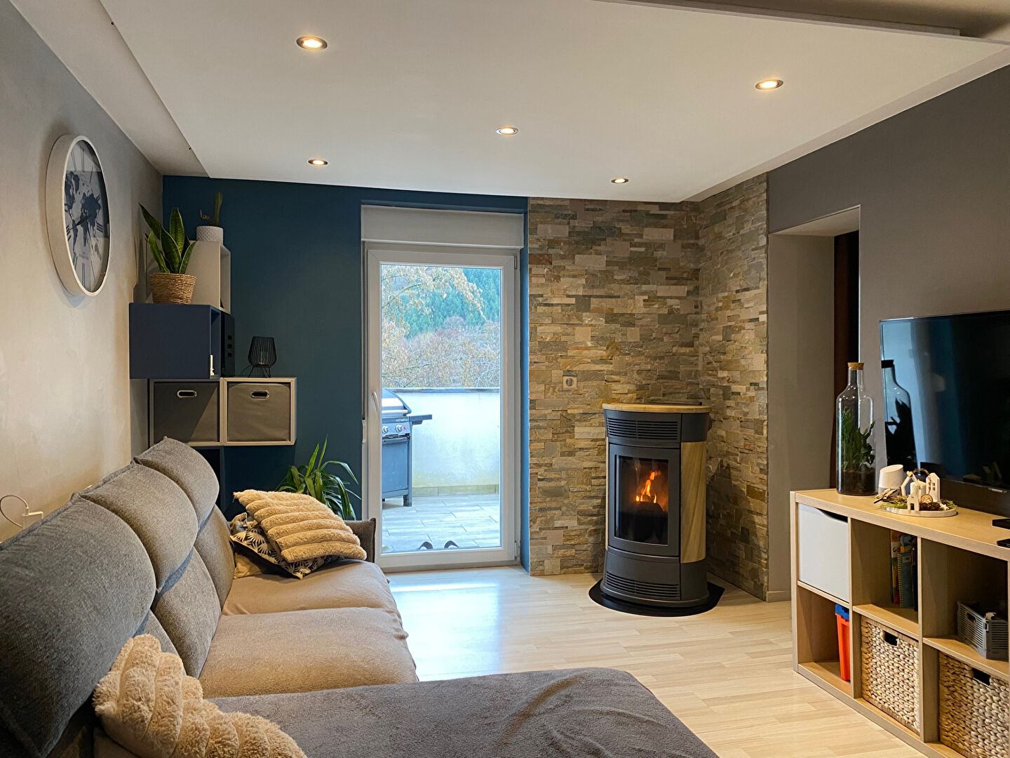 Chauffage produit par des radiateurs électriques et un poêle à pellets dans la pièce de vie.