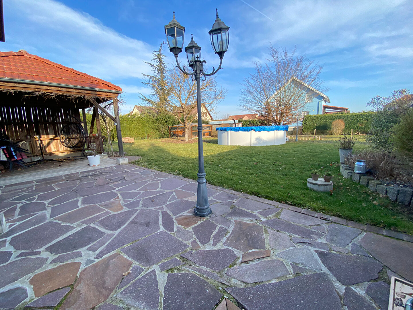 Un petit cabanon a été installé permettant du stockage, un poulailler et une piscine hors sol viennent finir de compléter cet aménagement.