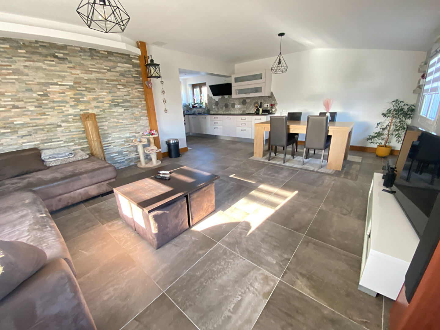 - couloir desservant la cuisine, équipée et ouverte sur un bel espace salon / séjour très lumineux