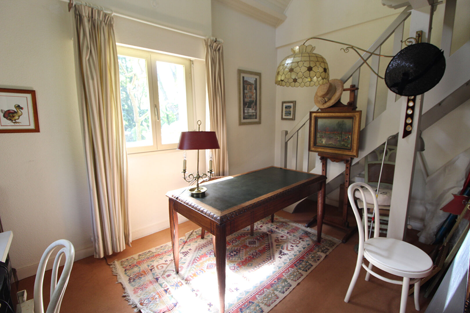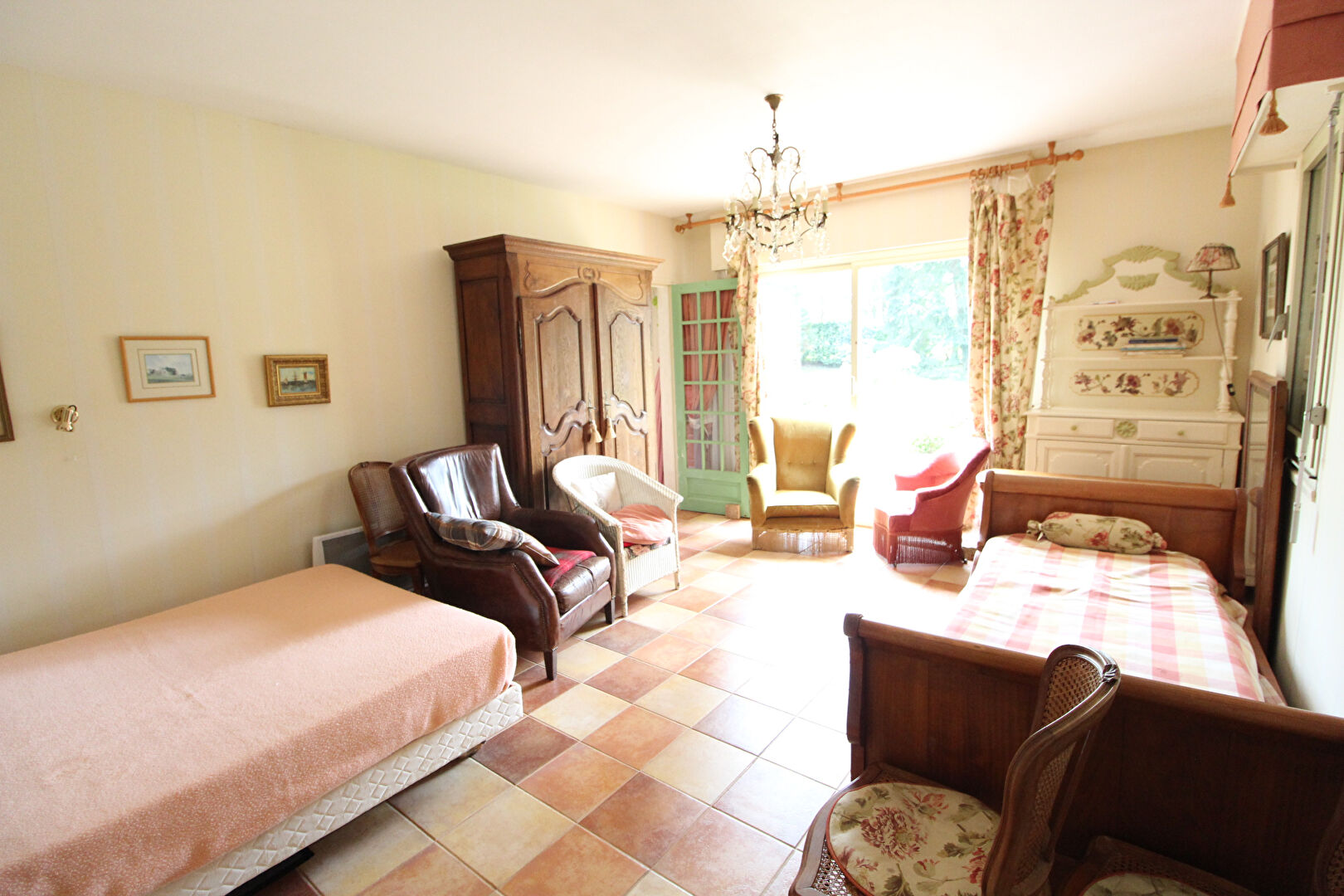 A l'étage : une mezzanine, une chambre avec salle de bains privative et WC, deux autres chambres, une salle d'eau, un WC.