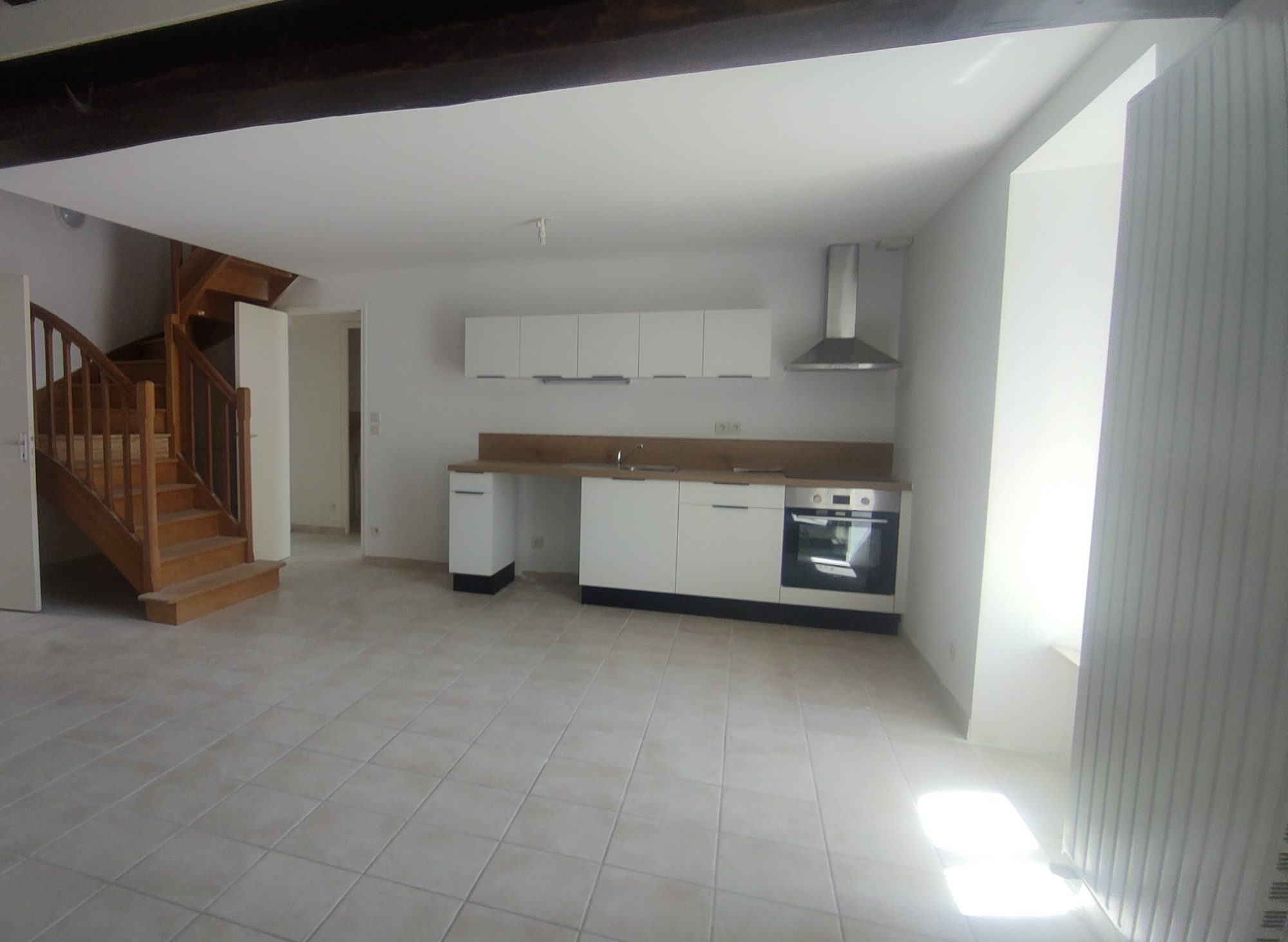L’entrée lumineuse accueille un espace buanderie et un coin bureau ou salon lecture. La pièce de vie, chaleureuse et agréable, met en valeur les poutres apparentes et s’ouvre sur une cuisine neuve, aménagée et équipée. Une cheminée est prévue pour l’installation d’un poêle.